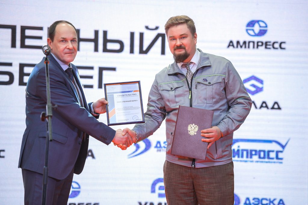 В честь открытия завода Андрей Крайнов, генеральный директор и Дмитрий Моисеенко, руководитель отдела международных отношений Кластера автомобильной промышленности поздравили руководство и трудовой коллектив компании Пенный берег и вручили свидетельство участника Кластера.