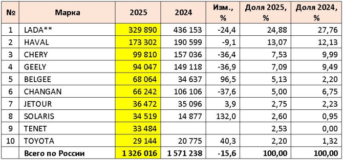 За весь прошлый год в нашей стране было реализовано 1 326 016 новых легковых машин, что на 15,6% меньше, чем в 2024 году. Об этом сообщают эксперты агентства «АВТОСТАТ» со ссылкой на данные АО «ППК»* и с учетом собственной сегментации. Около четверти (24,88%) от общего объема продаж приходится на отечественную марку LADA**, показатель которой в 2025 году составил 329 890 экземпляров. Между тем годом ранее ее доля находилась на уровне порядка 28%. Самым популярным иностранным брендом по итогам минувшего года остался Haval с результатом 173 302 единицы. Следующие две позиции в марочном рейтинге тоже занимают «китайцы» – Chery и Geely (99 810 и 94 047 шт. соответственно). Замыкает пятерку лидеров белорусский Belgee, объем реализации которого составил 68 064 автомобиля. Кроме них, в ТОП-10 также попали китайские Changan (66 242 шт.) и Jetour (36 472 шт.), отечественные Solaris (34 519 шт.) и TENET (33 484 шт.), японская Toyota (29 144 шт.). Среди представленных марок меньше других в продажах потерял Haval (-9,1%), а наиболее заметно «просели» Chery (-36,4%), Geely (-36,9%) и Changan (-37,6%). Из тех брендов, что демонстрируют положительную динамику, выделяются Solaris (+132%) и Belgee (+96,5%). Отдельно стоит отметить и рост в 40,3% у Toyota, автомобили которой в нашу страну официально не поставляются.