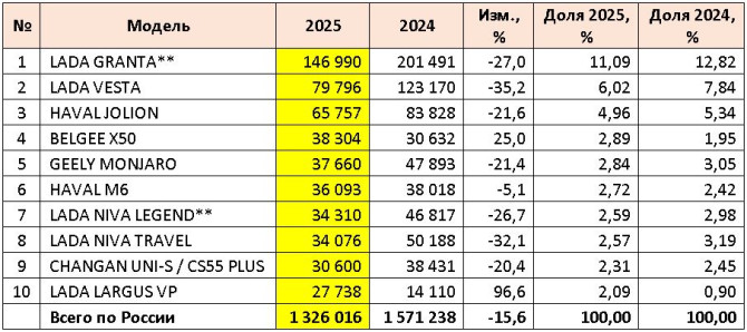 Лидерство в модельном рейтинге четвертый год подряд принадлежит автомобилям семейства LADA Granta (в т.ч. произведенным на его базе), которые в 2025-м разошлись тиражом в 146 990 экземпляров. Второе место занимает LADA Vesta (79 796 шт.), а лучшей иномаркой в РФ остался кроссовер Haval Jolion с результатом 65 757 единиц. В первую десятку вошли еще три отечественные, три китайские и одна белорусская модель. При этом «в плюсе» тут находятся только кроссовер Belgee X50 (+25%) и пассажирский универсал LADA Largus (+96,6%). Остальные восемь моделей показывают снижение, а самое сильное оно у «Весты» (-35,2%).