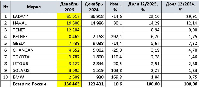 Если рассматривать итоги декабря, то за этот период в России было реализовано 136 463 новых легковых автомобиля. Это на 10,6% больше, чем за тот же месяц 2024 года. По сравнению с годовым рейтингом марок в декабрьском отсутствует Chery, но зато здесь присутствует BMW, замыкая его. Возглавляет его все так же LADA**, а вот замыкает тройку лидеров TENET. Стоит обратить внимание и на седьмую позицию Toyota.