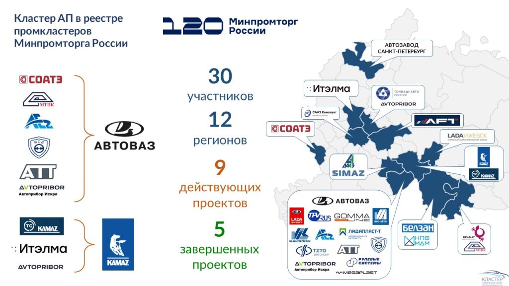 Участники промышленного Кластера автомобильной промышленности: АО «АВТОВАЗ», ПАО «КАМАЗ», ООО «ЛАДА Ижевск», ООО «ЛАДА Спорт», АО «ПСА ВИС-АВТО», ООО «Автозавод Санкт-Петербург», ООО «Точмаш-авто», ООО «НПК «Автоприбор», АО НПО «Белмаг», ООО «ДААЗ», ООО «СААЗ Комплект», АО «СОАТЭ», ООО «Ладапласт-Т», АО «ВИС», ОАО «ТЗТО», ООО «Гумма Лайн», АО «БелЗАН», ООО «СИМАЗ», ООО «ТПВ РУС», ООО «НПФ «МДМ», ООО «Рулевые системы», АО «АФТ Нижний Новгород», ООО «Аутокомпонент инжиниринг-2», ООО «АТТ», ООО «ИСБ», ООО «НПК Автоприбор Искра», ООО «МТПК», ООО «НПП «ИТЭЛМА», ООО «КТС», ЗАО «Мегапласт».