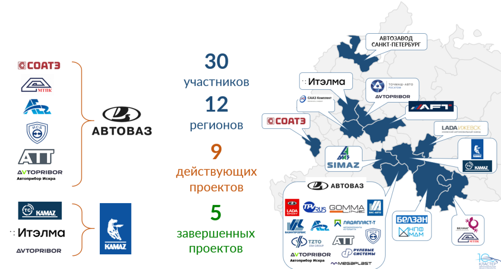 Участники промышленного Кластера автомобильной промышленности: АО «АВТОВАЗ», ПАО «КАМАЗ», ООО «ЛАДА Ижевск», ООО «ЛАДА Спорт», АО «ПСА ВИС-АВТО», ООО «Автозавод Санкт-Петербург», ООО «Точмаш-авто», ООО «НПК «Автоприбор», АО НПО «Белмаг», ООО «ДААЗ», ООО «СААЗ Комплект», АО «СОАТЭ», ООО «Ладапласт-Т», АО «ВИС», ОАО «ТЗТО», ООО «Гумма Лайн», АО «БелЗАН», ООО «СИМАЗ», ООО «ТПВ РУС», ООО «НПФ «МДМ», ООО «Рулевые системы», АО «АФТ Нижний Новгород», ООО «Аутокомпонент инжиниринг-2», ООО «АТТ», ООО «ИСБ», ООО «НПК Автоприбор Искра», ООО «МТПК», ООО «НПП «ИТЭЛМА», ООО «КТС», ЗАО «Мегапласт».